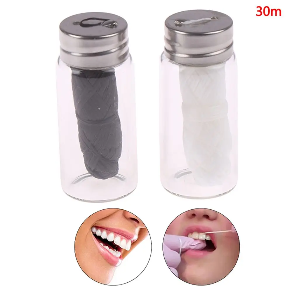 Features: The Dental Flosser wire can be replaced , the case can be Reused . Material: black is bamboo charcoal,Nude is corn Size : Case :2.5x5.5cm Length of Dental Flosser :30M Color: White, Black Package include: 1 x Dental Floss The floss is safe and non-polluting in the bottle and can be used with confidence. The floss is scented with mint, food-grade material, environmentally safe, easy to use Floss has 30m, high sex ratio, Long use time Remove plaque from between your teeth and along the gum line where a toothbrush cannot reach. Reduce gum disease and tooth decay. Micro wax dental flosser can clean the teeth better than the ones without Micro wax .